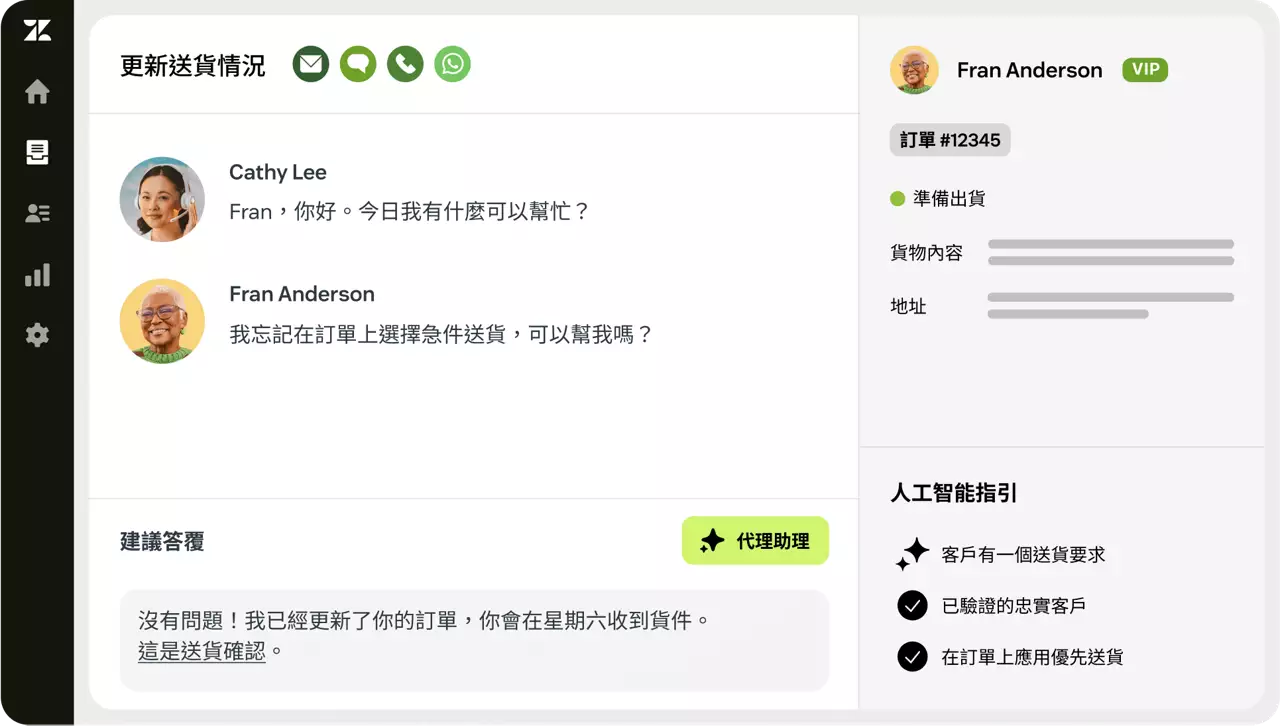 匯集來自所有渠道的客戶對話,為代理提供所需的背景資訊。 輕鬆存取管理面板和數據,提升你的服務品質。 從第一天使用起,Zendesk人工智能就開始自動解決要求。