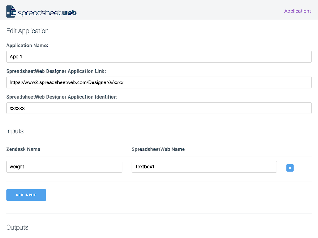 Once you are done creating inputs, press the Add Output button to select which fields are to display the results. Enter a Zendesk Name. As SpreadsheetWeb name, make sure to enter that formula cell's name i.e. cost, or its cell reference Input!B7. If you want to store this data in Zendesk, you can add those fields into Mapped Outputs.