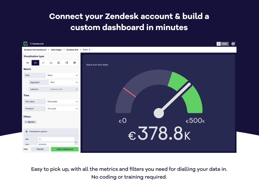 Easily build great-looking dashboards using live data from Zendesk Sell, with an intuitive interface anyone can use