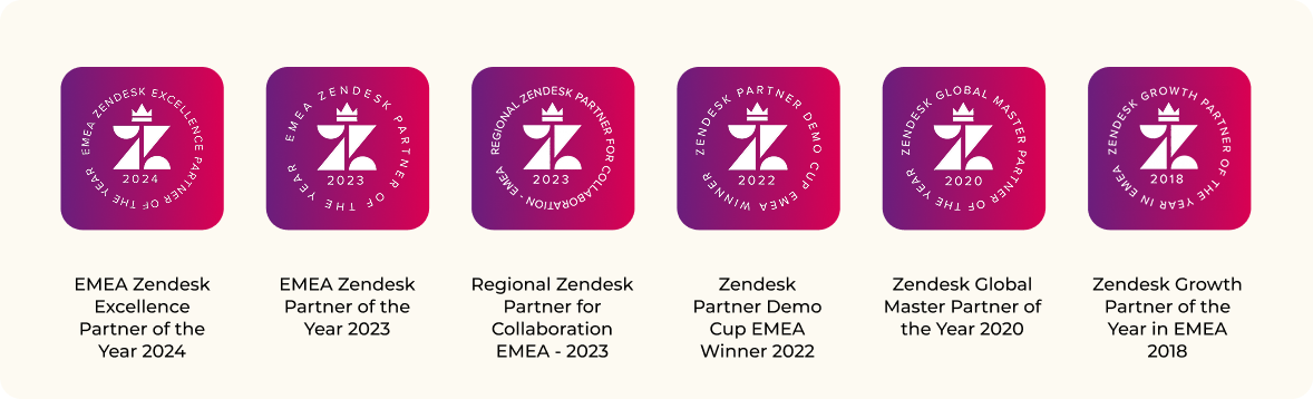 Award-winning expertise: Our dedication to delivering outstanding customer and employee experiences has earned us industry-wide recognition, including EMEA Zendesk Excellence Partner 2024, EMEA Zendesk Partner 2023, and Zendesk Global Master Partner 2020.