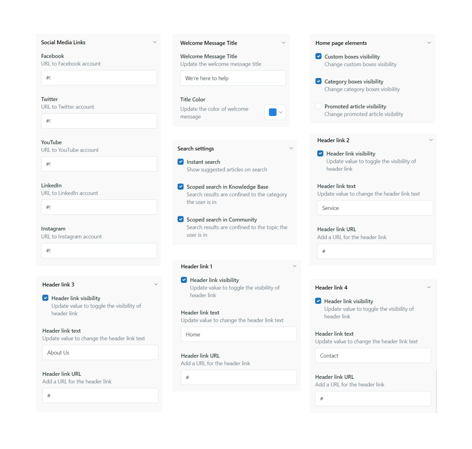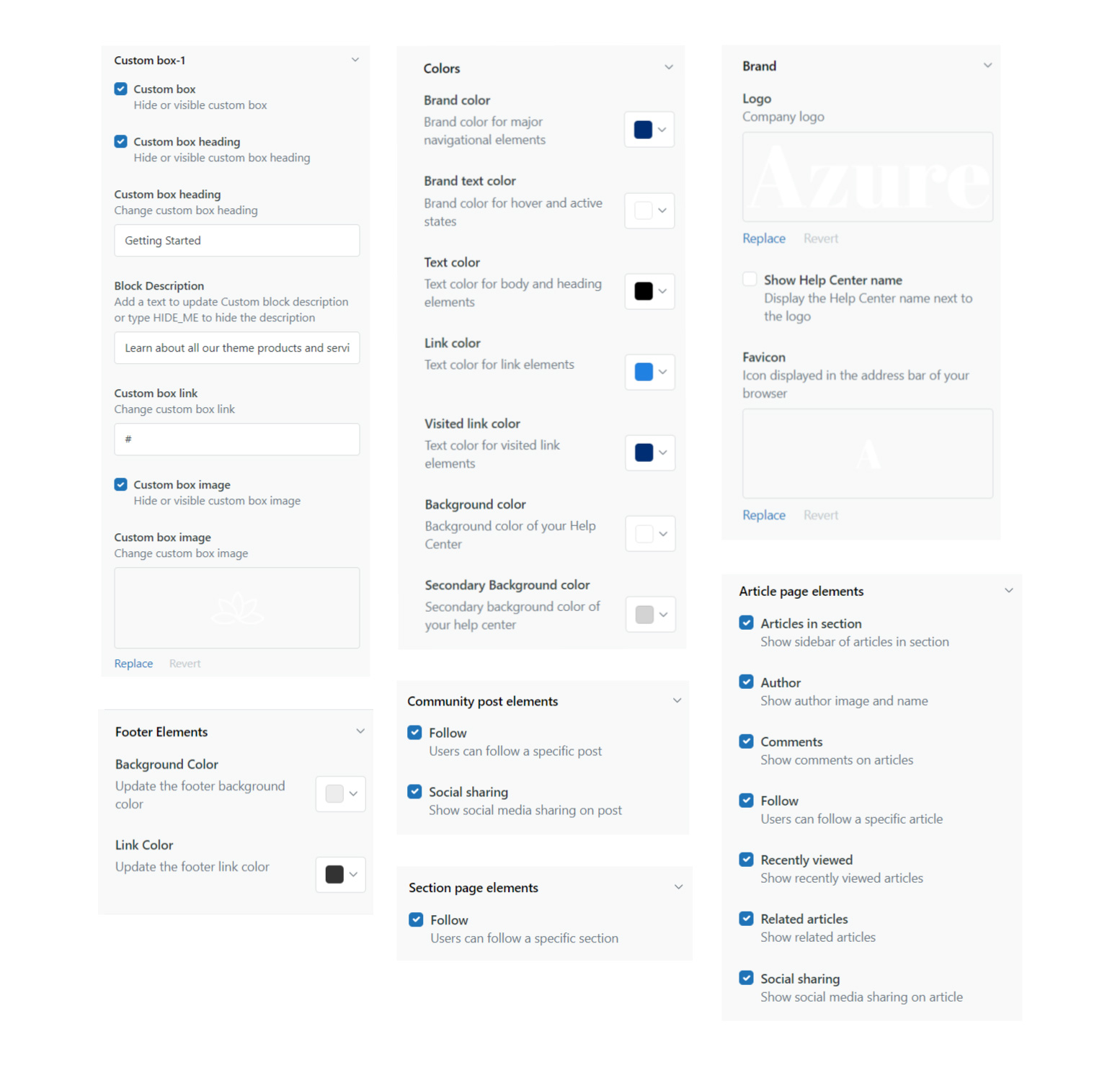 Colors (brand color, brand text color, background color, text color, link colors, header/footer background/text colors) Fonts (select from a list of font families Zendesk Theming provides). You can use custom web fonts (Google Font, or your own) in Developer Edition because you need to have code access to use custom fonts. Search Field Placeholder text Show/Hide Custom Blocks -- a set of icons on the homepage that can be used to link with anything (article, category, section, a page on your website, any page on internet) Manage Custom Block settings (change icon, change title, change link URL, use Dynamic Content for multiple language support, etc.) Change icon (image or font-awesome), text, links of Custom Blocks Show/Hide Categories on the homepage (learn about blocks); Category blocks are a set of icons which are generated from the list of categories in the Guide. If your help center has only one category, then all sections are listed as icons on the homepage. You will need a Developer Edition License to associate icon to be shown on the homepage for each category, or section (in case of single category help center). Toggle Minimal/Full Header and Footer. The Standard Edition only allows Minimal Header and Footer. You need to get Developer Edition to use full header/footer, and customize/change placeholder links with your own. Set/Unset social media links Show/Hide author meta on article pages Show/Hide sidebar Show/Hide Follow button in section or article pages and more. Multiple Lanuage support -- all relevant settings are localizable via Dynamic Content It is recommend that you purchase Developer Edition so you have access to complete code, and you can do custmization by changing CSS/HTML/JavaScript wherever needed. That said, the Standard Edition provides all important settings, and if you just want to get started it's good enough.