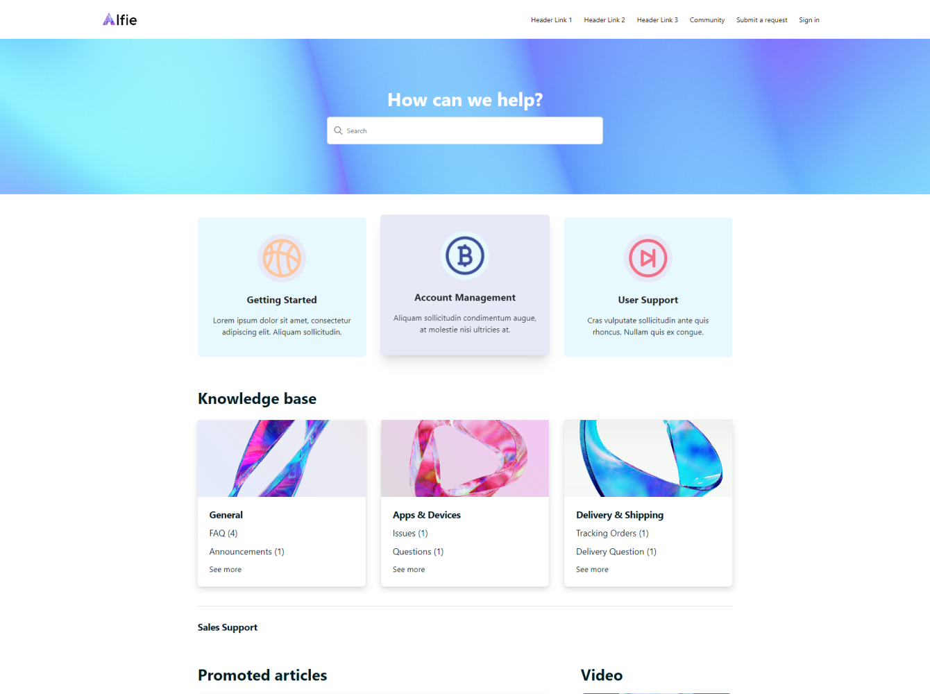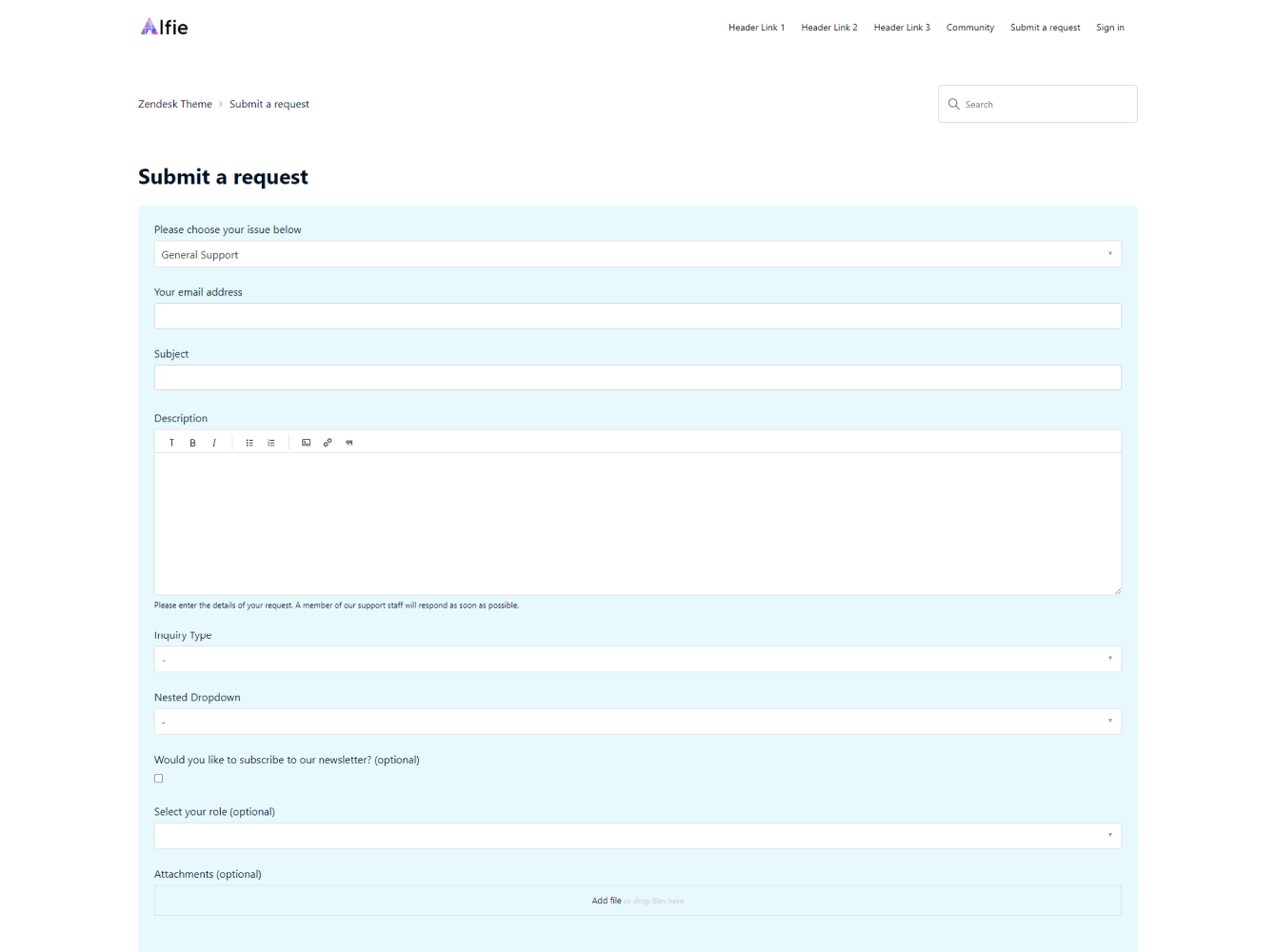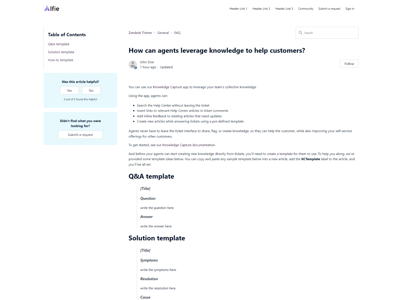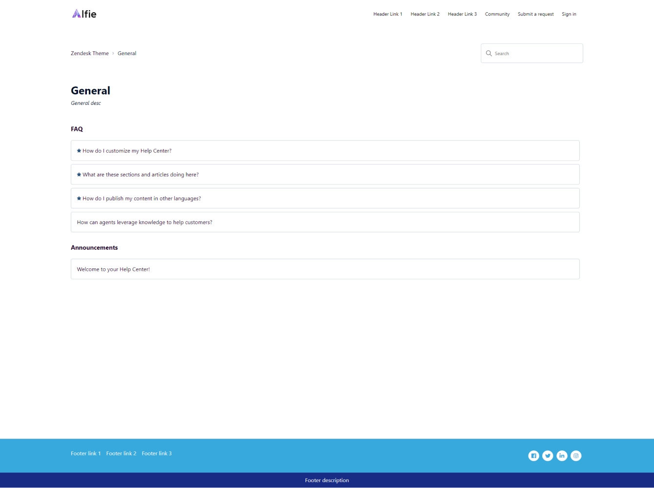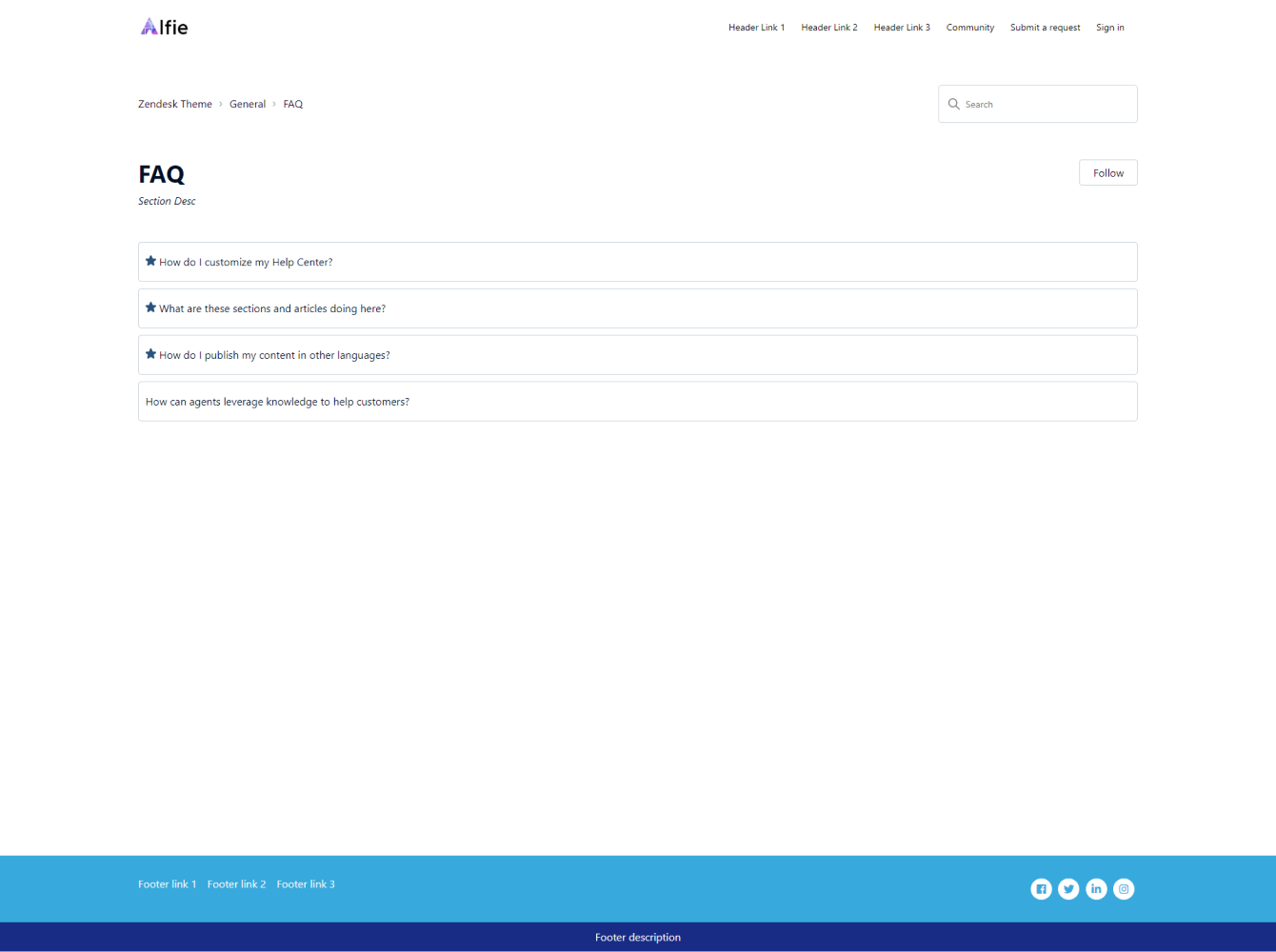 Alfie theme has a clean and modern layout and comes with all the necessary features to help you bring your help center vision to life. It includes the generative search feature and Templating API version 4.