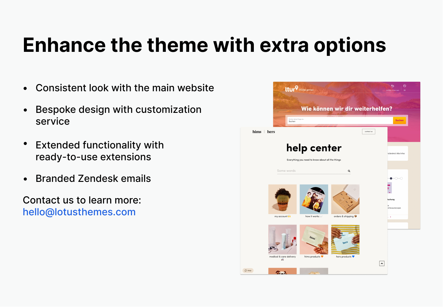 5,000+ companies have chosen Lotus Themes for their top-notch UX/UI design, consistent performance, ease of use, and multiple built-in features. Even Zendesk hires us to improve their help centers. View case studies →